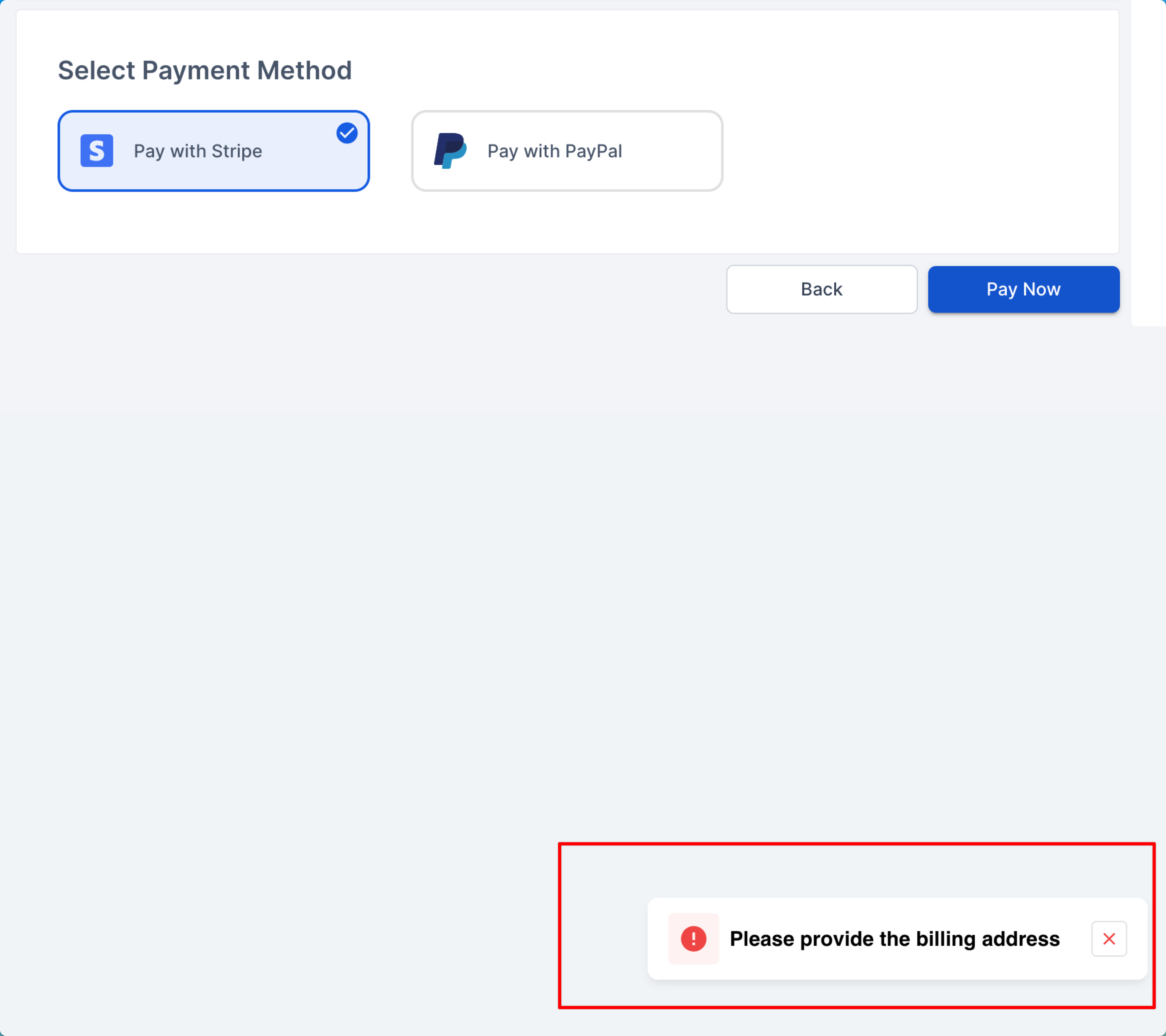 I have added the billing info, but when I click Pay Now, it gives an error. Please check the images.