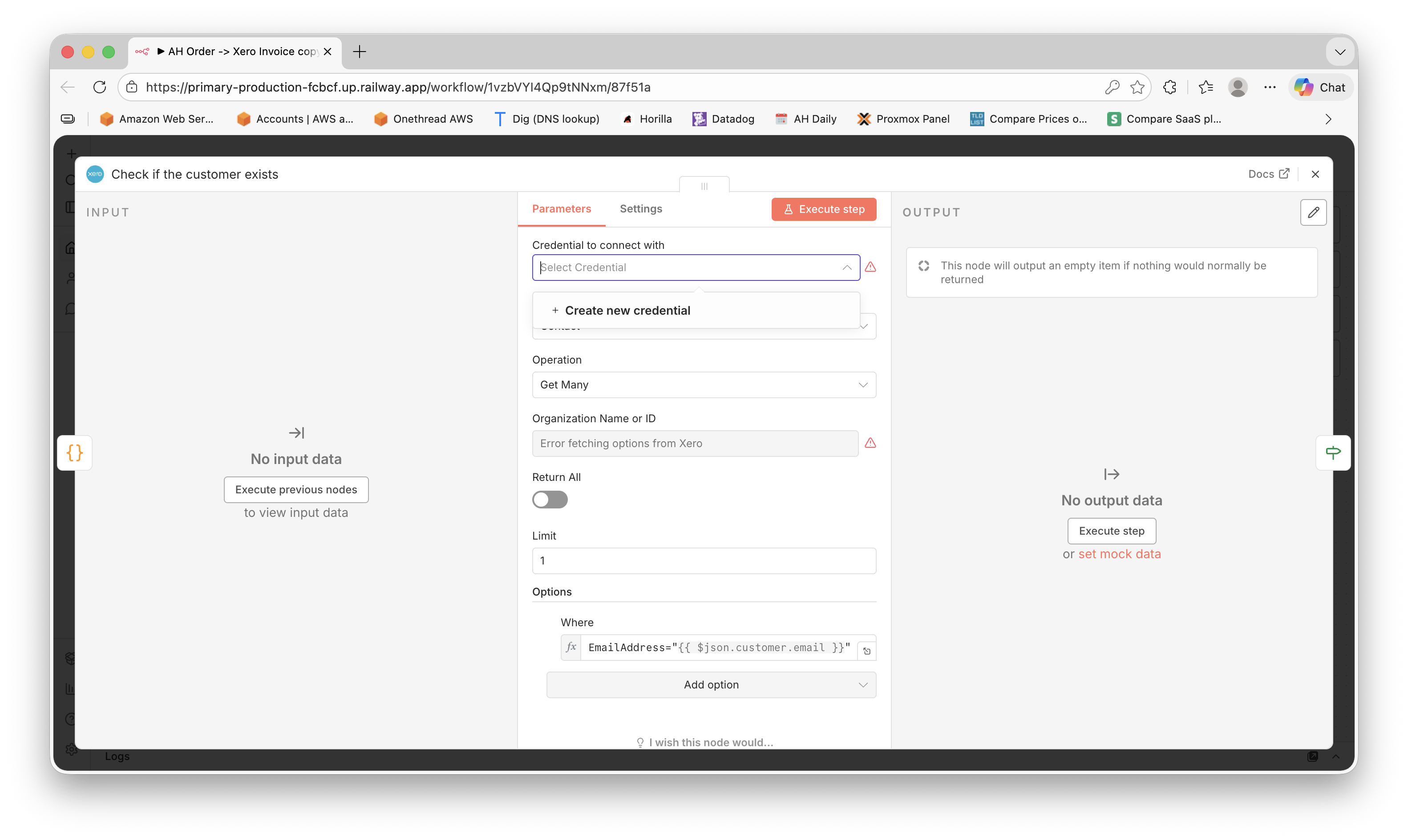 Double-click the ‘Check if the customer Exists’ node in the n8n workflow and create your credentials.